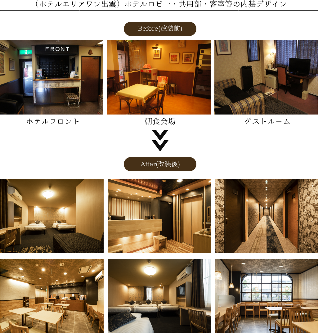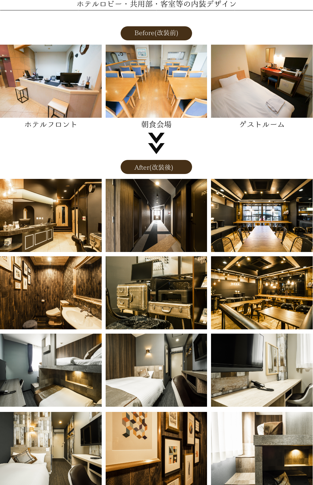 立地、客室数、改修前の既存スペック、状態、使われていた色、素材。